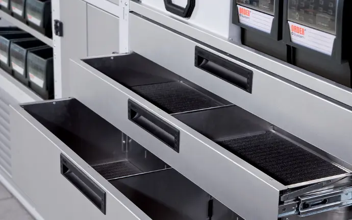Jede Schublade besitzt einen ergonomischen Griff und lässt sich einhändig öffnen. Gefertigt aus hochfestem Stahl tragen sie hohe Lasten trotz geringer Materialstärke und eignen sich ideal für schweres Transportgut.